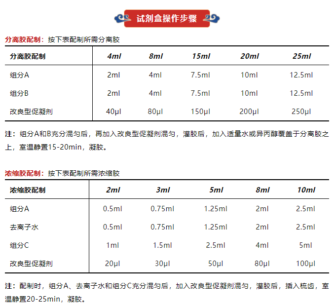 普利萊深挖SDS-PAGE蛋白凝膠電泳基本理論結(jié)合既往產(chǎn)品實(shí)踐經(jīng)驗(yàn),經(jīng)研發(fā)優(yōu)選,全新推出可以同時(shí)分離10-300kDa寬范圍大小條帶、分辨率高、電泳速率快的通用系統(tǒng),即UltraGel寬范圍高分辨配膠試劑盒,與常規(guī)配膠試劑盒相比具有以下特征: